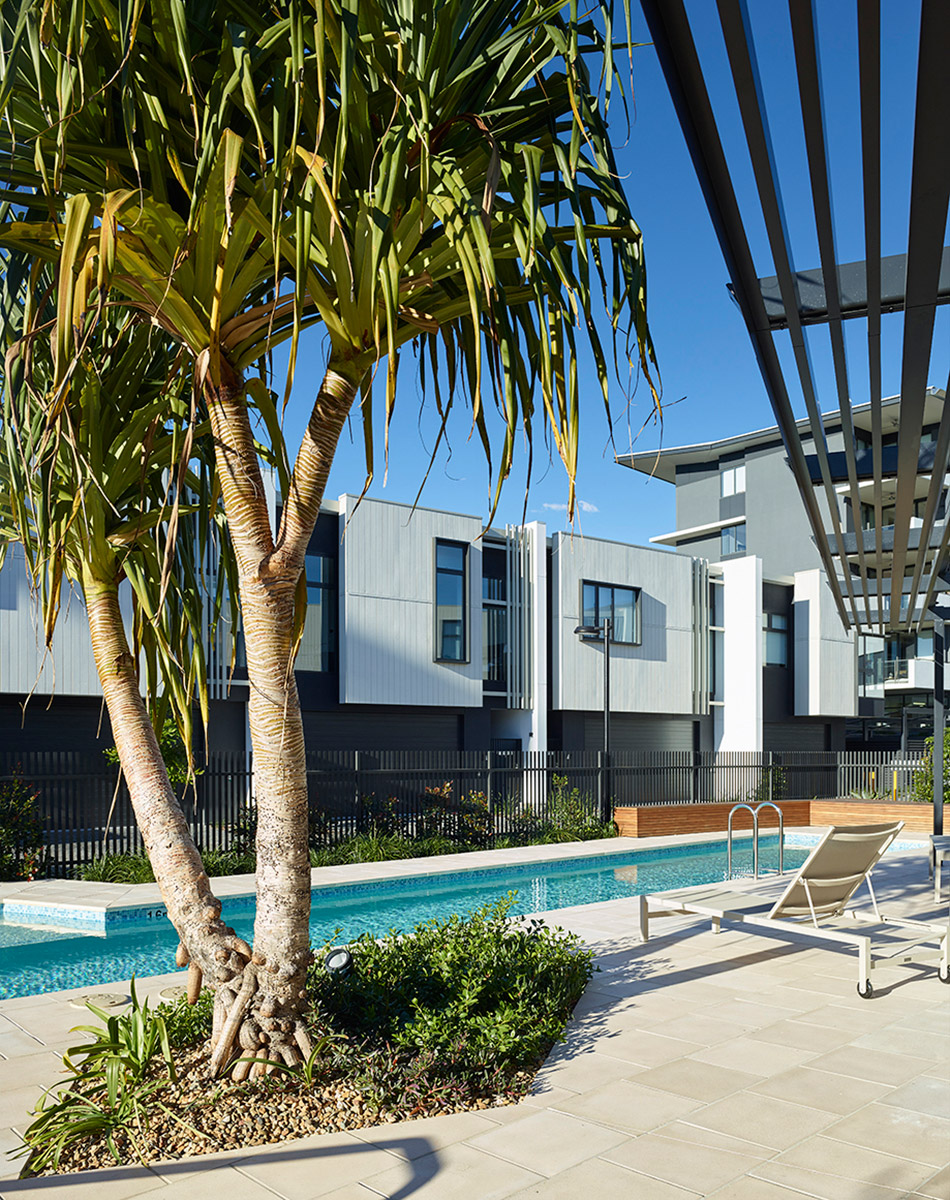Landscape entwines between the residences, inviting residents to move naturally between street, common areas and mangrove walk that borders the neighbouring Royal Queensland Golf Club.